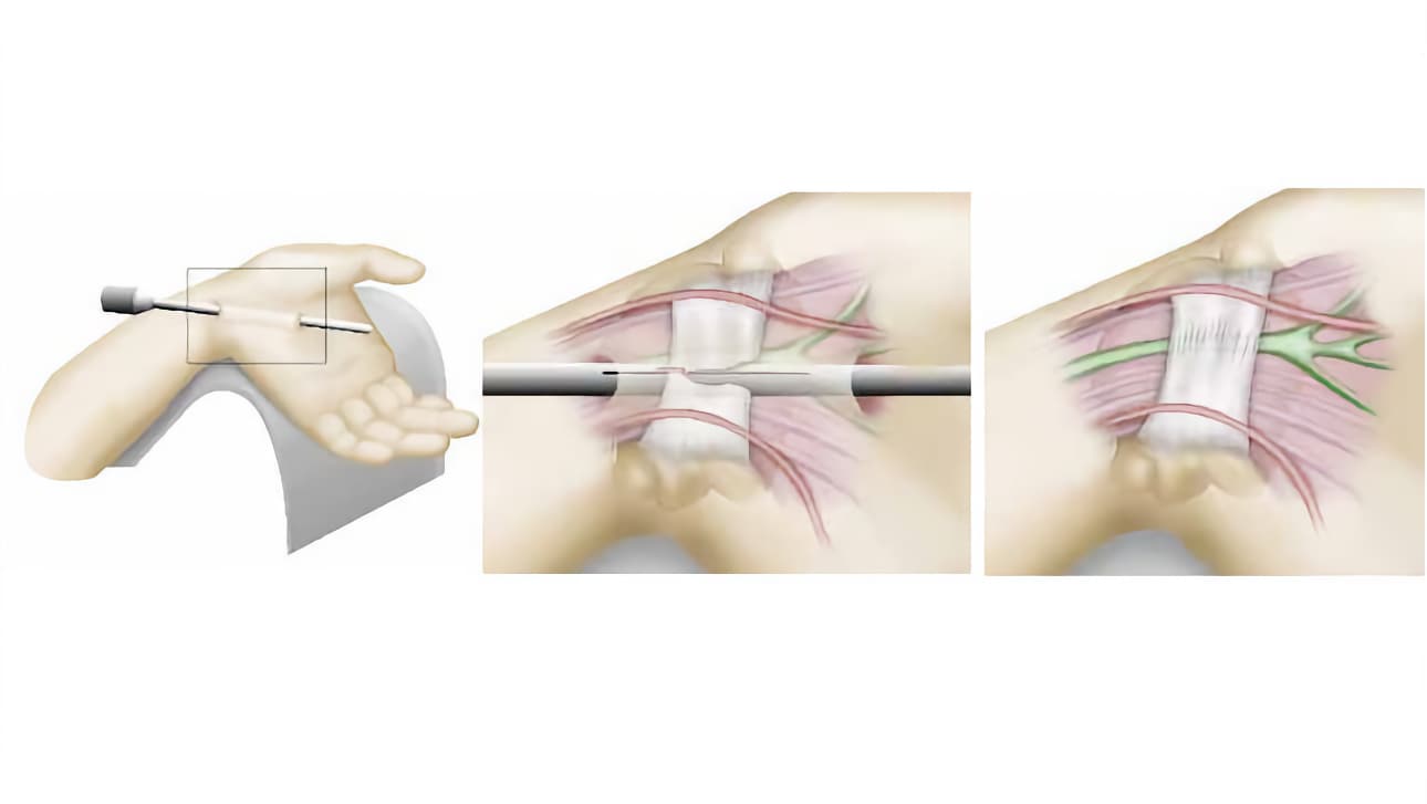 Ο χειρουργός πραγματοποιεί είτε μια μόνο τομή ενός εκατοστού στον καρπό από τη μεριά της παλάμης, είτε δύο τομές, η δεύτερη στην παλάμη του χεριού. Στη συνέχεια, παραμερίζει τις μικρές φλέβες και τα μικρά νεύρα για να μην τα τραυματίσει.