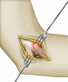 Ο χειρουργός πραγματοποιεί την τομή στην πλάγια επιφάνεια του αγκώνα. Το μέγεθός της είναι 3 έως 10 εκατοστά, ανάλογα με την περίπτωσή σας και τις πιθανές επιπλέον ενέργειες στις οποίες χρειάζεται να προβεί. Στη συνέχεια, ανοίγει το σάκο που προστατεύει τους μυς (απονεύρωση) για να φτάσει τους μυς και τους τένοντες.