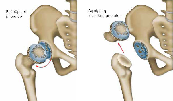Αντιθέτως, όταν διαπιστώσει ολική καταστροφή των επιφανειών, αφαιρεί τις περιοχές που έχουν υποστεί βλάβη και προχωρεί στην αντικατάστασή τους με τεχνητά μέρη (πρόθεση), που εξασφαλίζουν την ανώδυνη λειτουργία της άρθρωσης. Αυτή η επέμβαση, που παρουσιάζεται σε αυτό το φυλλάδιο, ονομάζεται αρθροπλαστική ισχίου.