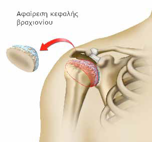 Πρόκειται για την αφαίρεση των περιοχών του οστού, των οποίων ο χόνδρος έχει φθαρεί και την αντικατάστασή τους με ένα ή περισσότερα τεχνητά μέρη ανάλογης μορφής (πρόθεση). Η επέμβαση αυτή επιτρέπει την ανώδυνη κίνηση του ώμου.