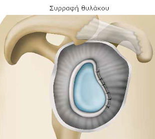 Ο χειρουργός αποσπά το θύλακο που περιβάλλει την άρθρωση και ανάλογα με τις βλάβες που διαπιστώνει, διατήρει το μέρος εκείνο που προσεγγίζει τη φυσιολογική του μορφή. Μόλις τον επανατοποθετήσει στη θέση του, προχωρεί στη συρραφή για να τον σταθεροποιήσει στην κεφαλή του βραχίονιου.